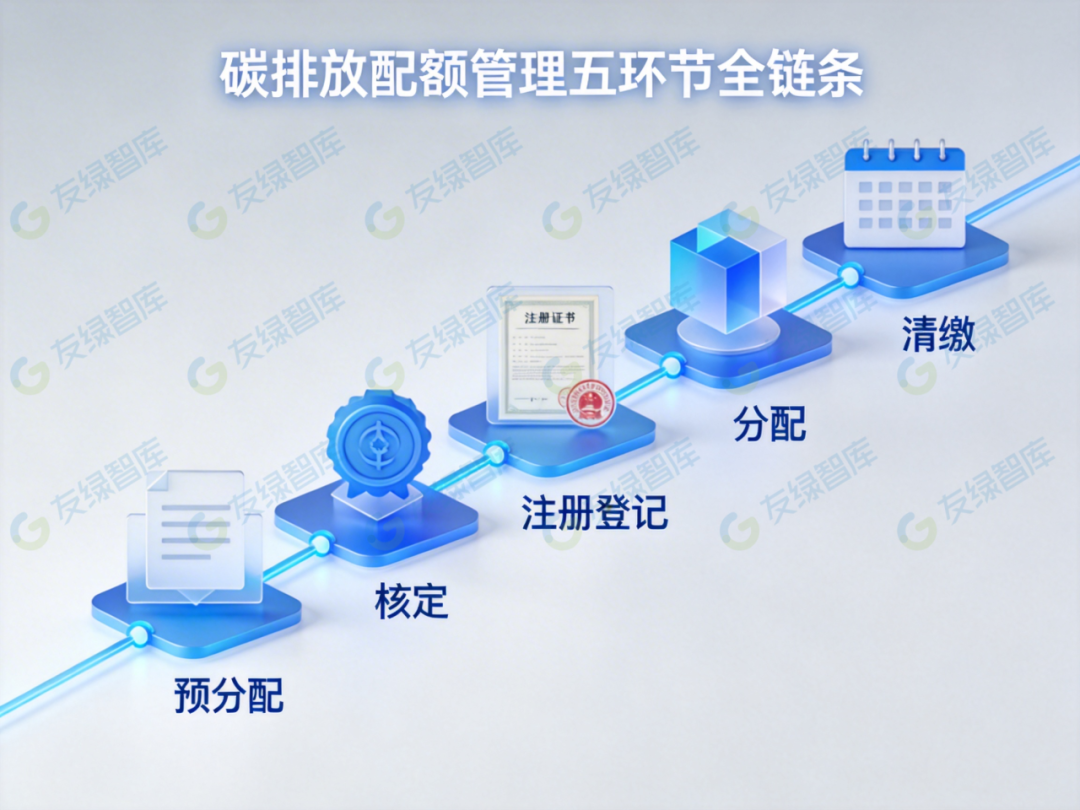 《通知》对碳排放配额管理进行了全流程拆解,将原有“分配-履约”的两环节流程,细化为“预分配-核定-注册登记-分配-清缴”的五环节全链条,实现了配额权属的清晰化和操作的规范化: