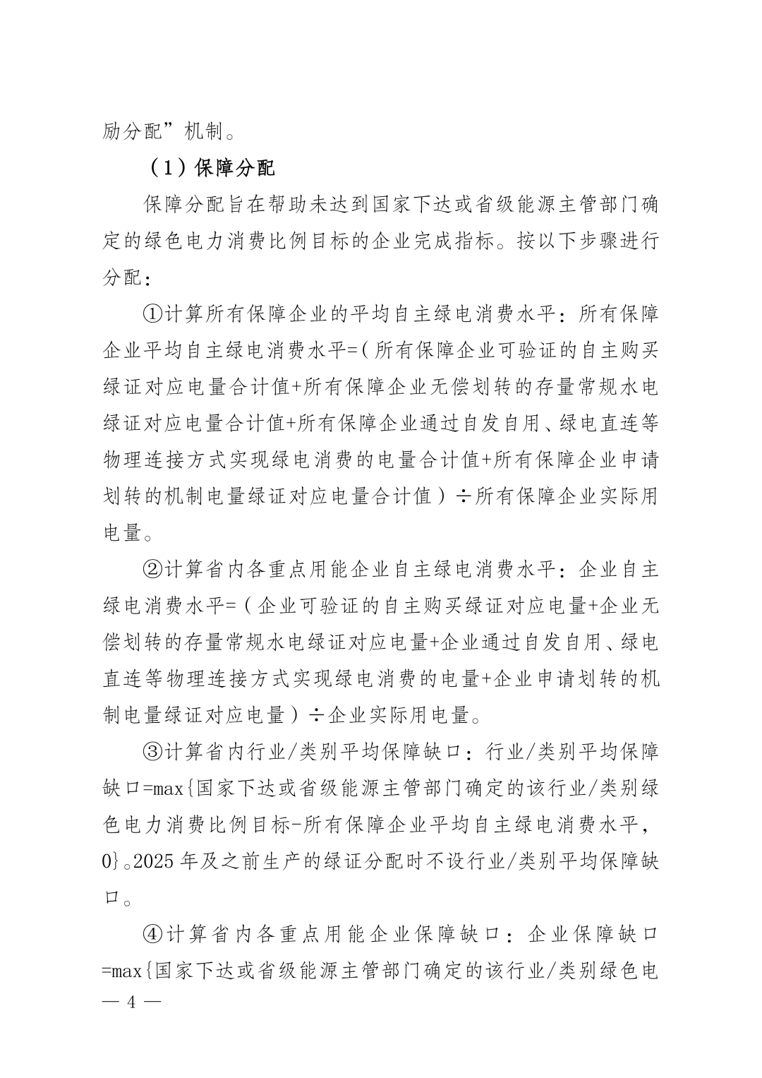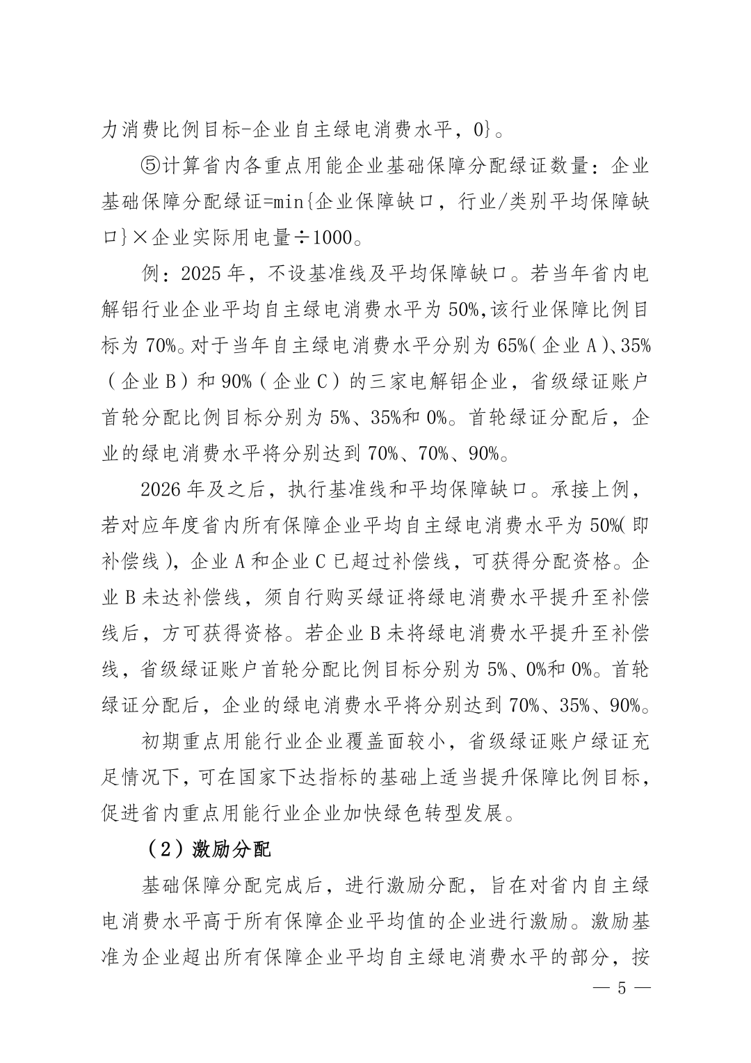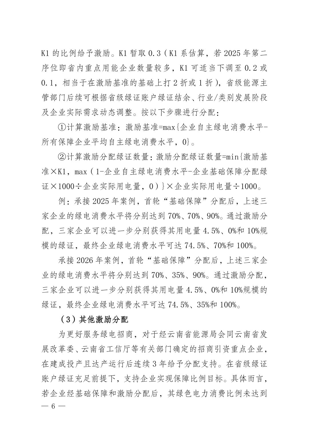 在分配机制上执行保障分配、激励分配的制度。保障分配旨在帮助未达到国家下达或省级能源主管部门确定的绿色电力消费比例目标的企业完成指标。通过计算企业“自主绿电消费水平”与“目标比例”的缺口,按缺口分配绿证,帮助企业完成目标;基础保障分配完成后,进行激励分配,旨在对省内自主绿电消费水平高于平均水平的企业,按超出部分的30%给予额外绿证;其他激励主要针对招商引资重点企业,投产运行后连续3年给予分配支持,确保其达到保障目标。