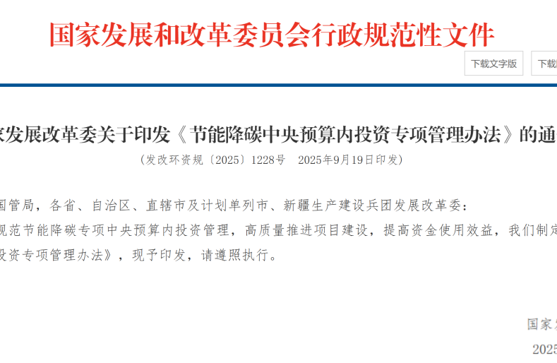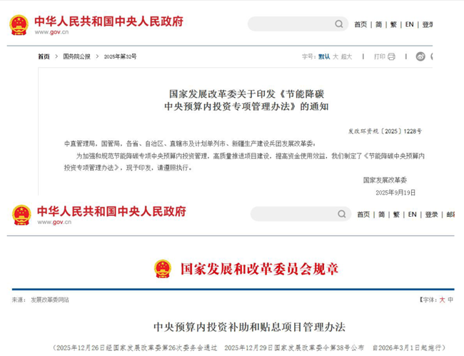 国家发展改革委《节能降碳中央预算内投资专项管理办法》(发改环资规〔2025〕1228号,2025年9月19日印发),国家发展改革委《中央预算内投资补助和贴息项目管理办法》(2025年12月26日经国家发展改革委第26次委务会通过,第38号公布,自2026年3月1日施行)。