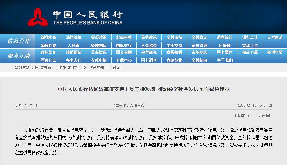 中国人民银行在2026年1月15日也发布了拓展碳减排支持工具支持领域,加大中国银行绿色固定资产贷款、绿色流动资金贷款、绿色贸易贷款、绿色贸易融资的支持力度,推动经济设计发展全面绿色转型的落地。