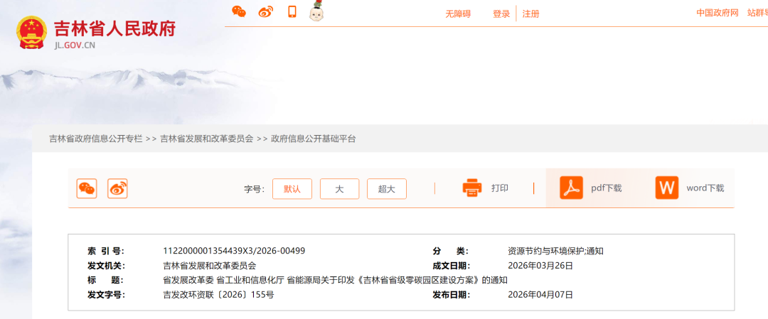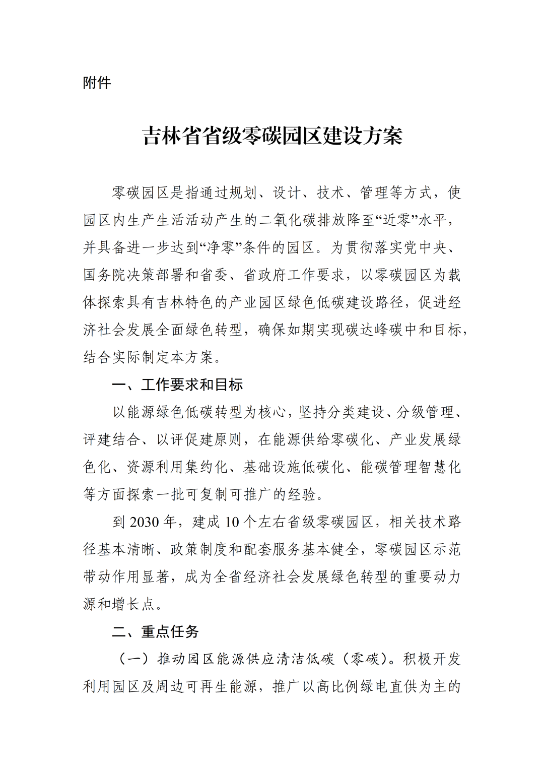 按照省委、省政府关于零碳园区建设工作部署,为积极稳妥推进碳达峰,加快经济社会发展全面绿色转型,省发展改革委、省工业和信息化厅、省能源局制定了《吉林省省级零碳园区建设方案》,请结合实际抓好落实。