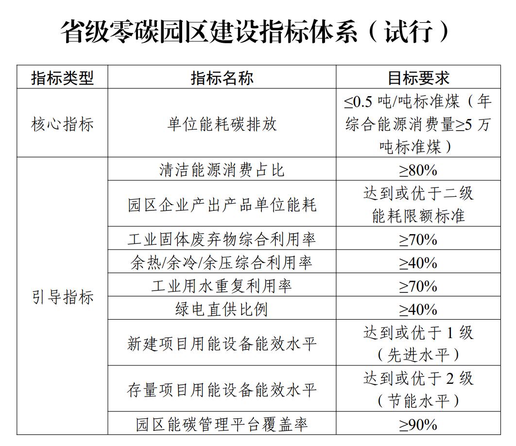 方案同步发布省级零碳园区建设基本条件、申报书大纲、建设指标体系及碳排放核算方法,核心指标要求单位能耗碳排放≤0.5吨/吨标准煤(年综合能源消费量≥5 万吨标准煤),引导指标包含清洁能源消费占比≥80%、绿电直供比例≥40%、园区能碳管理平台覆盖率≥90%等内容。