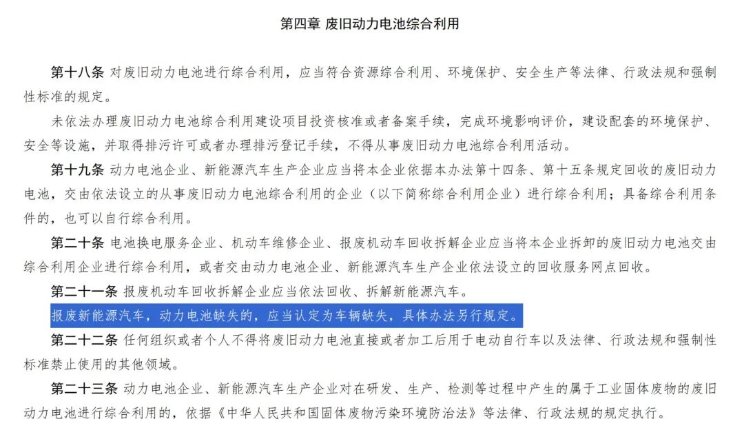 《办法》中重点明确了“车电一体报废”制度,明确报废新能源汽车时应当带有动力电池,否则按照有关规定认定为车辆缺失。