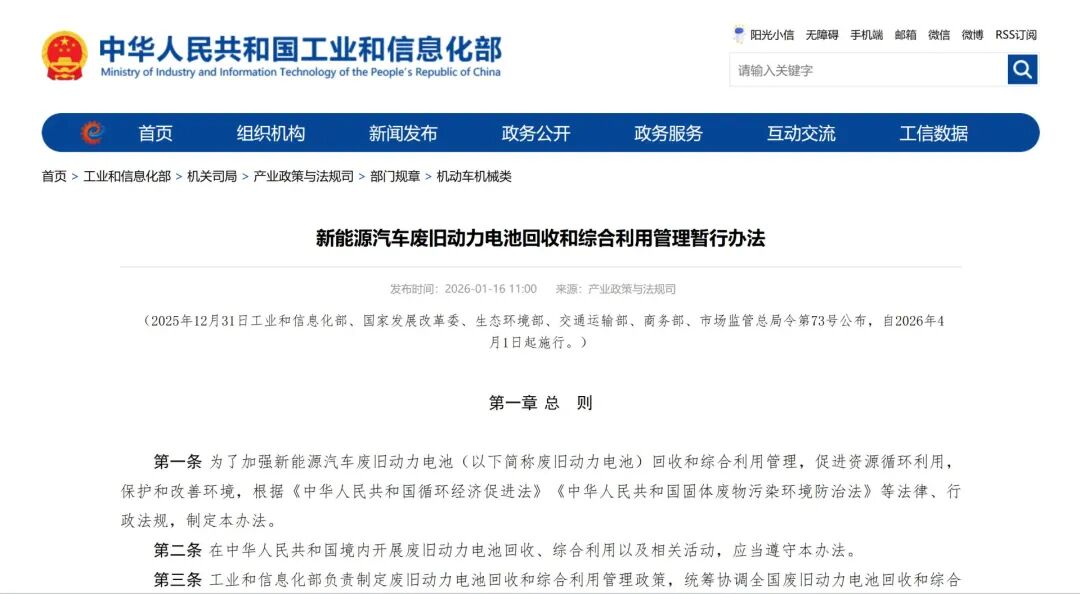2026年4月1日起,工信部、国家发改委、生态环境部等六部门联合发布的《新能源汽车废旧动力电池回收和综合利用管理暂行办法》(下称《办法》)正式实施。本文全面解析新规从“鼓励引导”到“强制规范”的政策升级脉络,解读主体责任划分,探讨“一池一码”全生命周期溯源、车电一体报废等核心机制,帮助读者了解新规如何遏制非法回收“小作坊”、加速行业洗牌、重塑动力电池回收产业的全新格局。